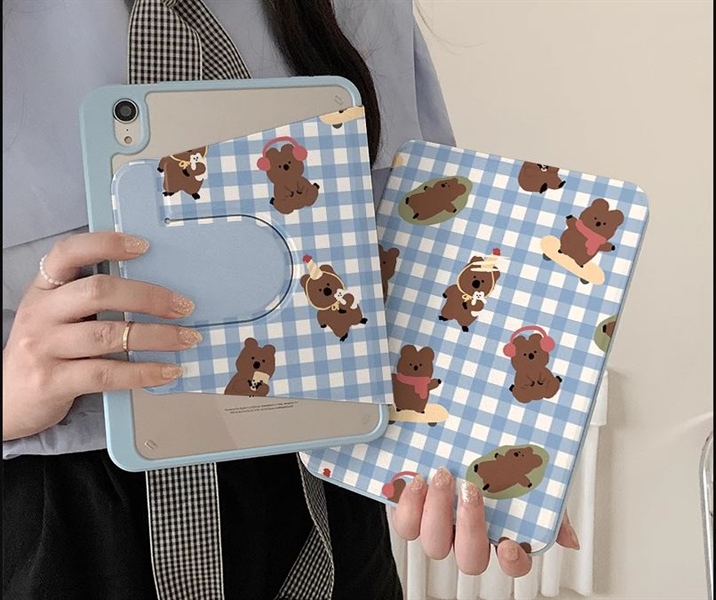 Case Ipad Caro Xanh Gấu Nâu- 12.9Inch